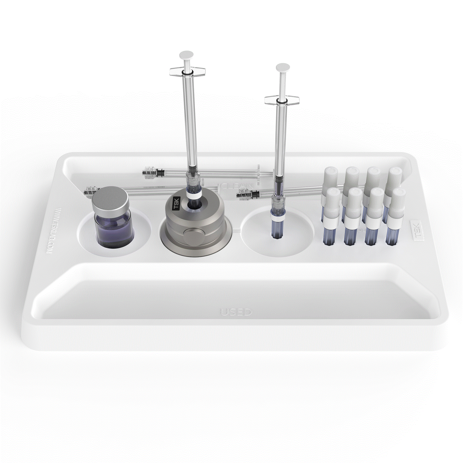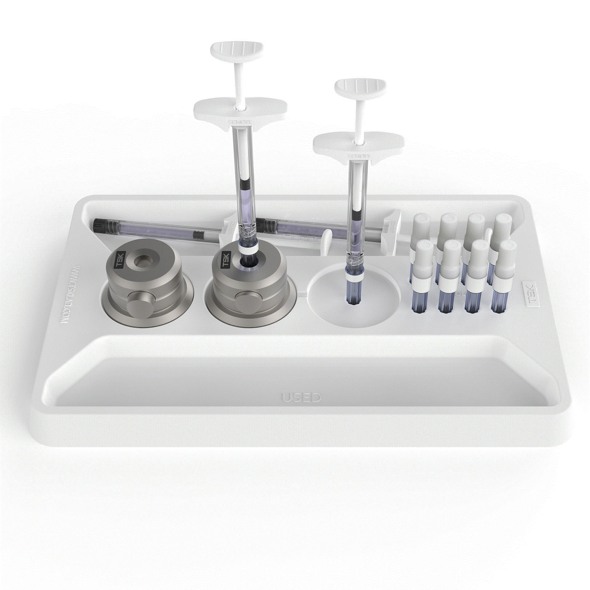 Das TSK Treatment Tray ist so konzipiert, dass es mit allen TSK-Nadeln, TSK-Kanülen und allen gängigen BoNT-Fläschchen und Dermal Filler-Spritzen kompatibel ist.